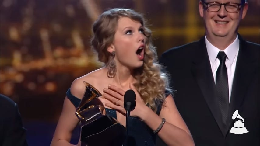 A little Knowlesian Theory: Taylor and Beyoncé haven’t directly competed for AOTY since the notorious 2009/10 awards year. Taylor won her first Album of the Year for Fearless in 2010. She was in an overlapping album cycle with Beyoncé, who was promoting I am…Sasha Fierce. You may remember that it was while Taylor was being presented with her VMA for “Best Female Video” for You Belong With Me that Kanye West invaded the stage to say that Beyoncé should have won for Single Ladies. He shouldn’t have done it, but he was right on the merits. You couldn’t say the same for Fearless winning AOTY over I Am… Sasha Fierce. If any Beyhive want to set me straight I’ll submit humbly but I doubt it’s anyone’s favourite Bey album. It was a weak year overall: other nominees included The Black Eyed Peas, Dave Matthews Band and Gaga with The Fame. I don’t think Fearless would have won against the 2009 class, which had great country albums in Raising Sand by Robert Plant and Alison Krauss, and a Lady A record. And by 2011 Taylor’s pop peers were peaking: Gaga had raised her game in the form of The Fame Monster. Katy Perry campaigned Teenage Dream and lost to Arcade Fire. So apparently someone does remember who came second!